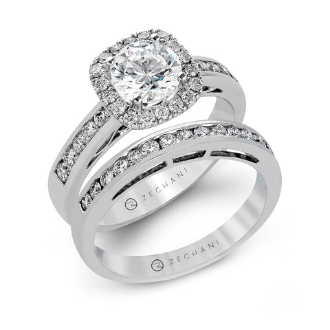 This bridal set features a cushion-shaped halo engagement ring with a brilliant round center stone and a coordinating diamond band. The channel-set diamonds along both rings add symmetry and sparkle, offering a timeless and elegant look.