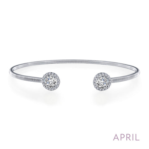 April - Diamond. Adorn yourself with Lafonn's birthstone jewelry. This flexible stackable open cuff halo bangle bracelet is set with Lafonn's signature Lassaire simulated diamonds. Bracelet is in sterling silver bonded with platinum.