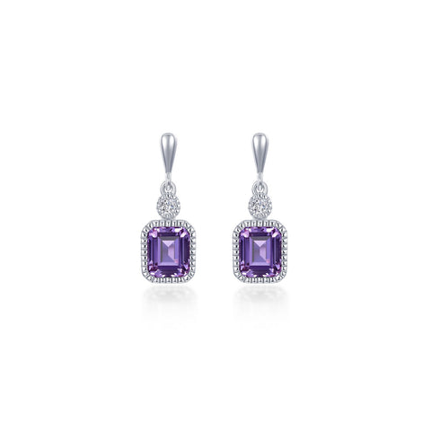 February - Amethyst. Adorn yourself with Lafonn's birthstone jewelry. Each of these gorgeous earrings features an emerald-cut simulated amethyst and a Lafonn's signature Lassaire simulated diamond. The earrings are in sterling silver bonded with platinum.