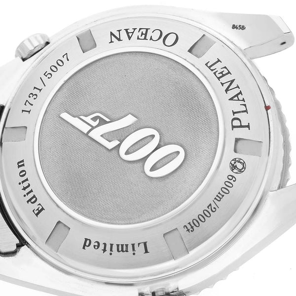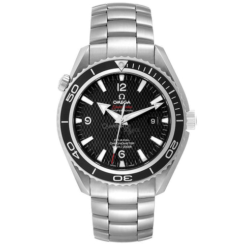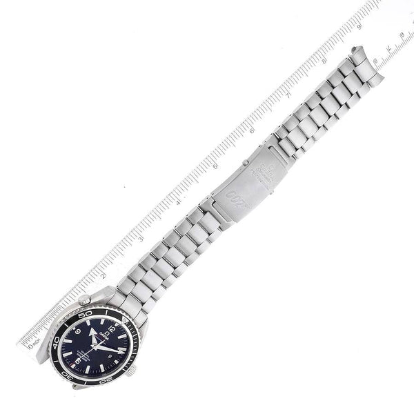 Omega Planet Ocean Quantum Solace Limited Edition Steel Mens Watch 222.30.46.20.01.001 Card. Automatic self-winding chronograph movement. Stainless steel round case 45.5 mm in diameter. Caseback is embossed with the 007 logo. Black uni-directional rotating bezel. Scratch resistant sapphire crystal. 'Quantum of Solace' is engraved on a crystal. Black textured dial with luminescent index hour markers. Raised Arabic numerals at 6, 9, and 12 o'clock. Date calendar window at 3 o'clock aperture. Stainless steel bracelet push button deployant clasp. Fits 8" wrist