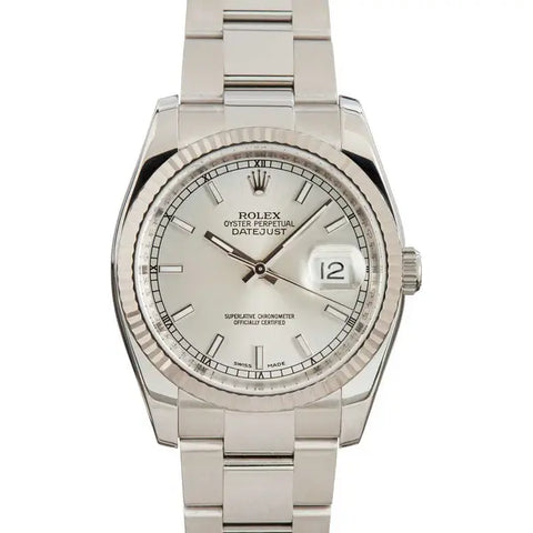 Refined and timeless, this pre-owned Rolex Datejust ref. 116234 (2006–2007) showcases a sleek silver dial framed by an 18k white gold fluted bezel. Crafted from stainless steel and paired with the versatile Oyster bracelet, it offers a perfect balance of elegance and durability. Powered by the reliable Caliber 3135 movement, this Datejust remains a true classic. Adding to its collectibility, the original green factory sticker remains intact on the caseback, preserving its charm.