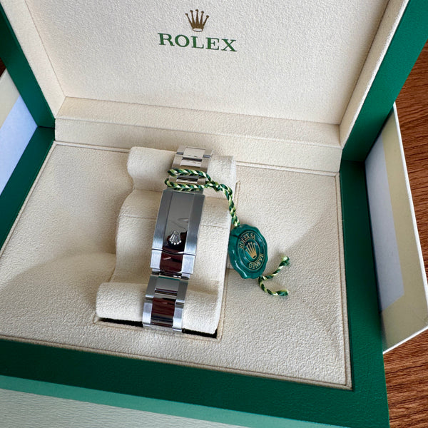 Light is diffused consistently along each engraving, creating a characteristic subtle glow that moves depending on the position of the wrist. Once the sunray finish has been completed, the dial color is applied using Physical Vapor Deposition or electroplating. A light coat of varnish gives the dial its final look. This Rolex is like new and it comes with the original box and card.