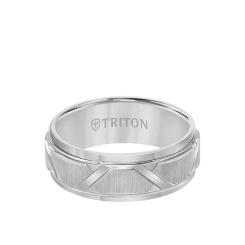8mm White Tungsten Carbide Step Edge Comfort Fit Band with Vertical Satin Finish and Bright Edges and Cuts