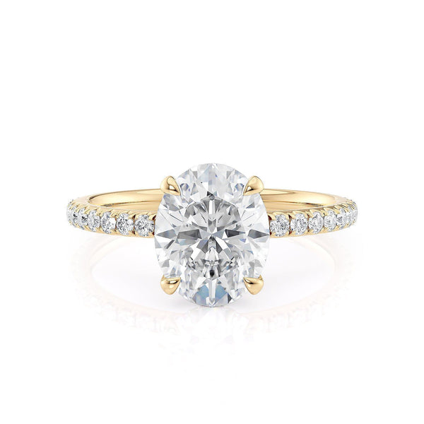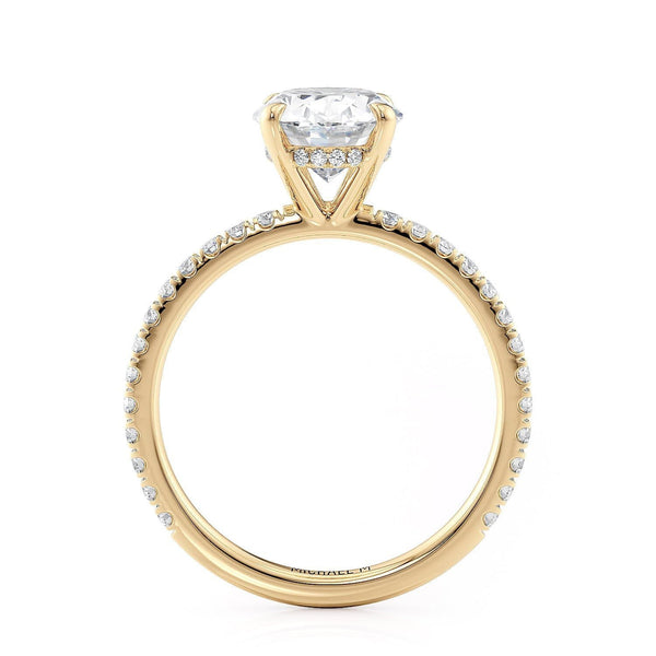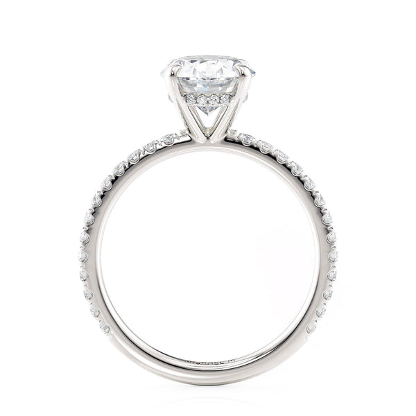 Expertly crafted with a breathtaking 2 carat oval-cut stone, the Crown R706-2 is the perfect combination of beauty and sophistication. The inclusion of round diamonds along the shank and a hidden halo enhance the overall elegance of this stunning piece.