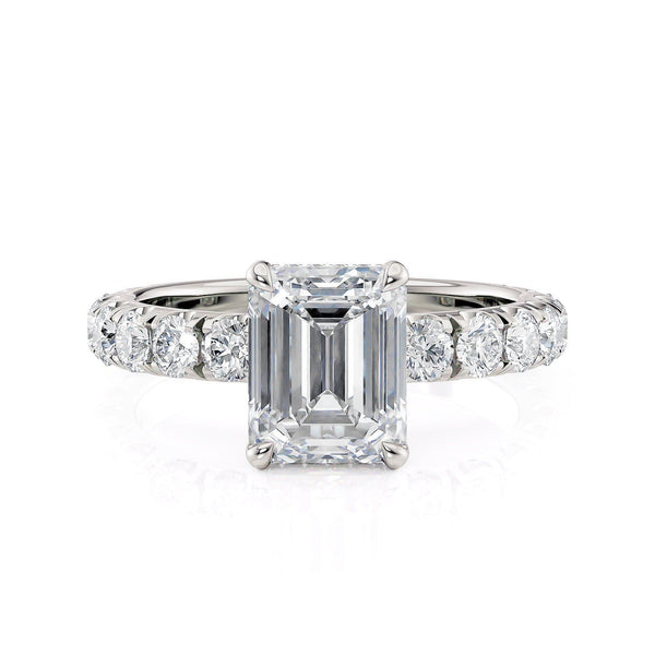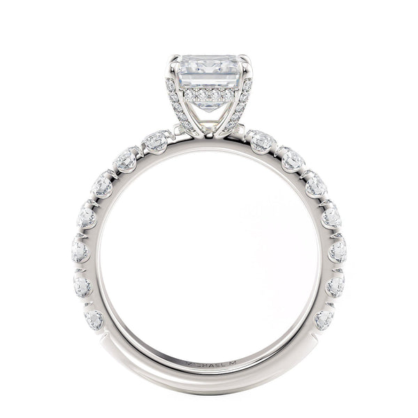 This stunning Crown R731-2 Emerald ring showcases timeless elegance, masterfully crafted to perfection. Boasting a brilliant 2 carat emerald-cut diamond, it is adorned by a sparkling diamond band and accents encircling the center stone.