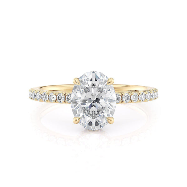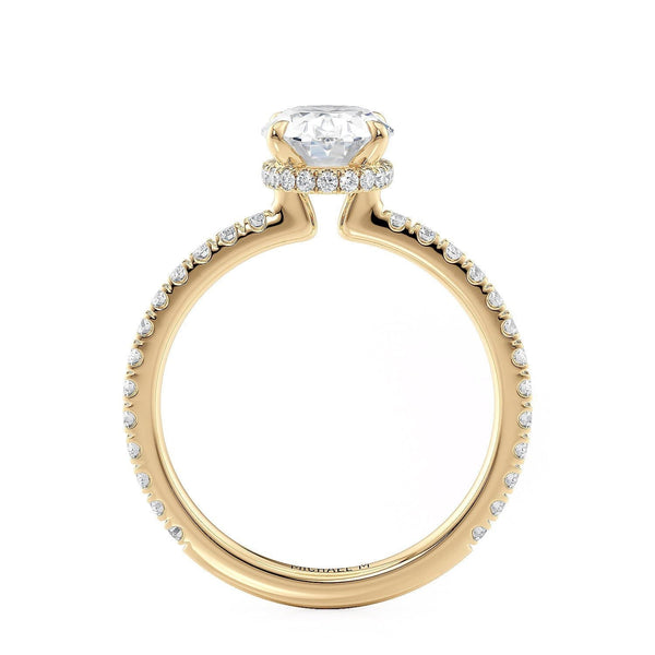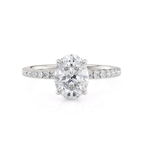 The esteemed Crown R742-2 Oval ring features a beloved design that stands the test of time. Meticulously made with precision, it showcases an exquisite 2 carat oval-cut diamond, accented by a shimmering diamond band and a hidden halo around the center stone.