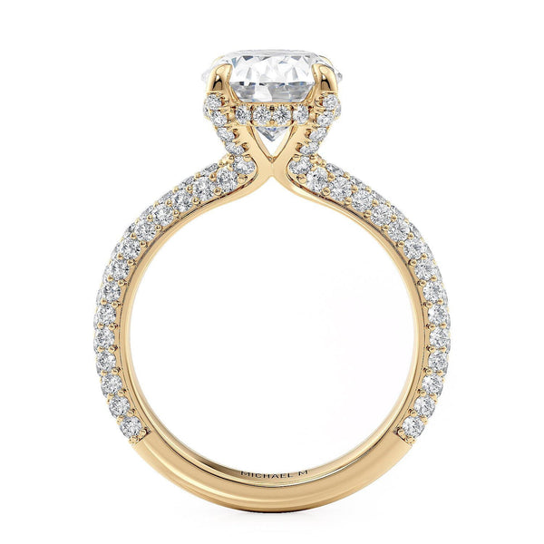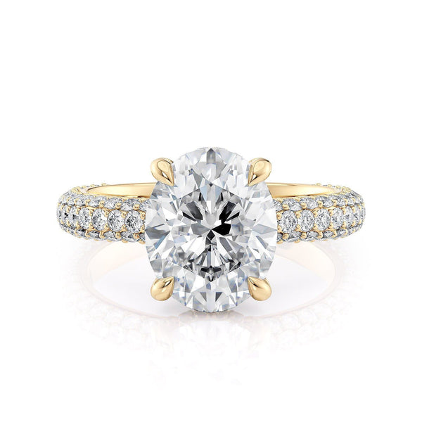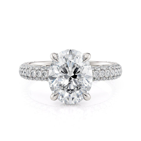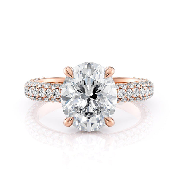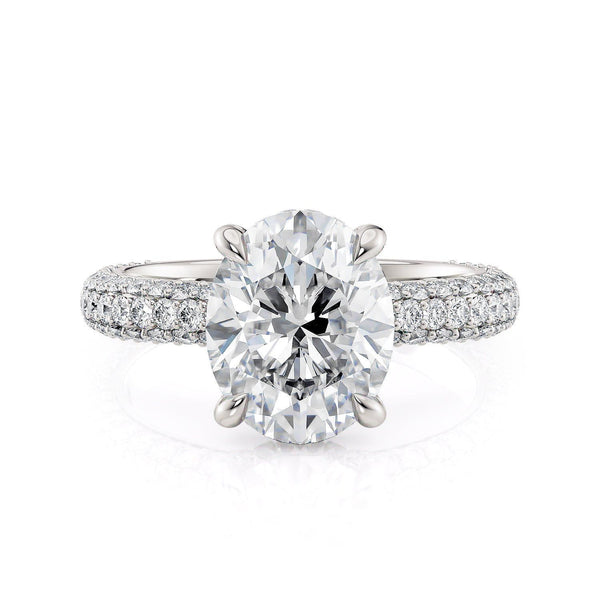 The Crown R812PV-3 Oval features a three-row pavé design that runs parallel to the shank. Each diamond is carefully drilled and set by hand for a truly impeccable finish.