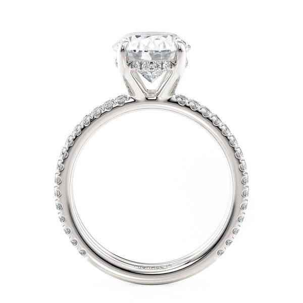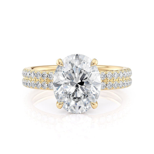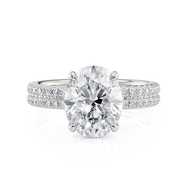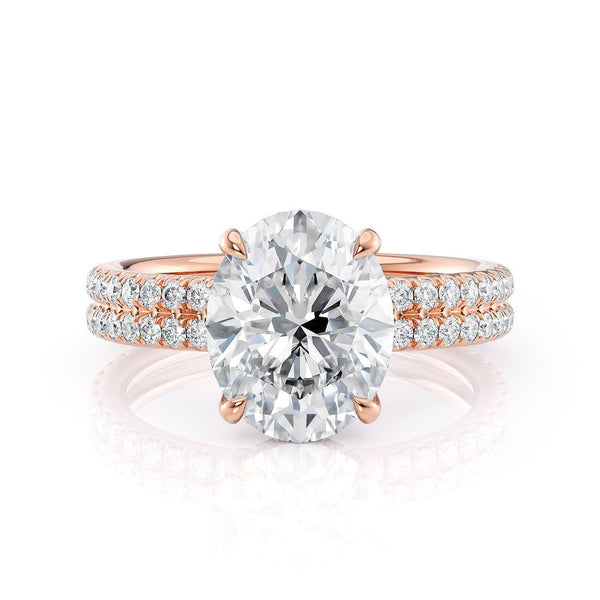The Crown R818-3 showcases a dual band design adorned with pavé diamonds running parallel to each other on both connecting bands. Additionally, it boasts a discreet halo feature.