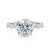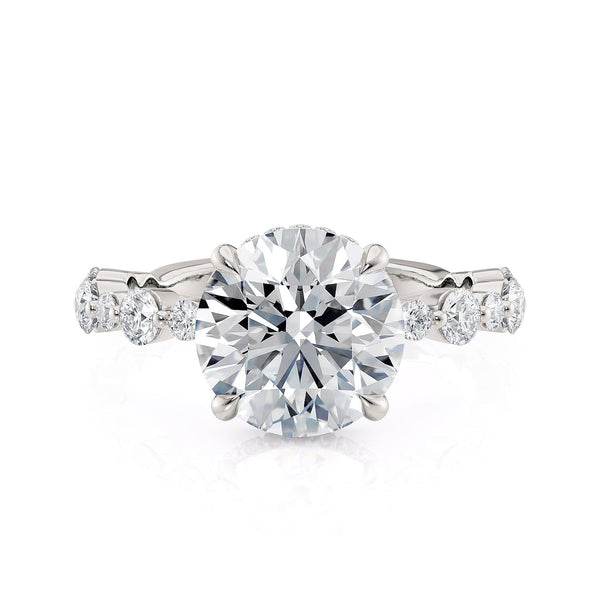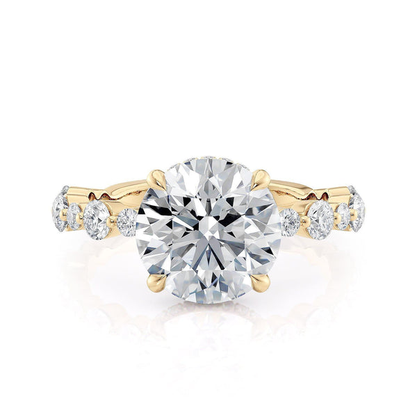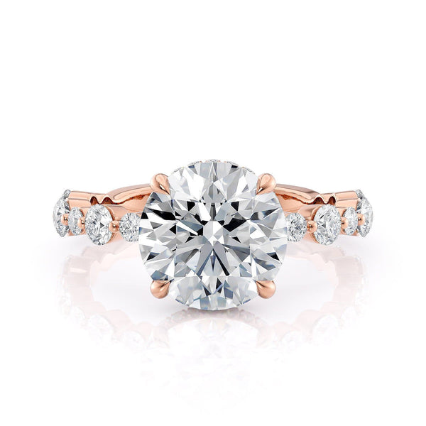 The Montage R822-3 presents a stylish arrangement of round diamonds alternating between small and large sizes along the band, complemented by the concealed halo encircling the center stone. This design provides a contemporary and distinctive aesthetic.