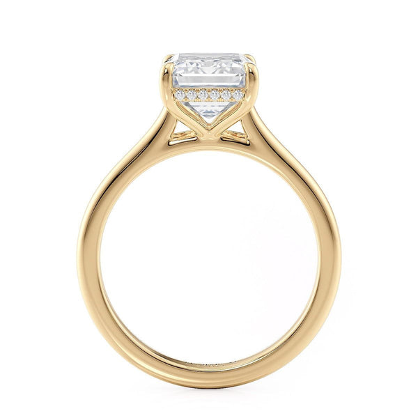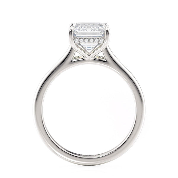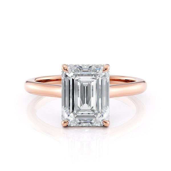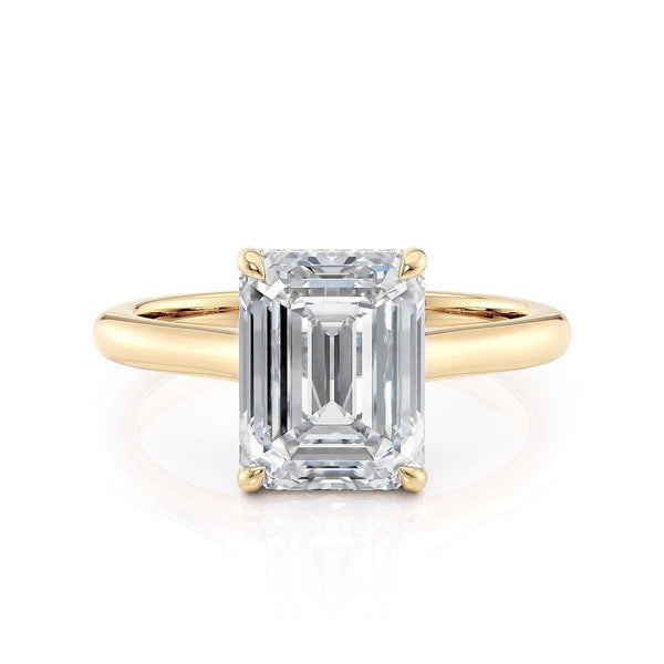 The R826-3 Emerald ring from our Crown Collection features our famous "Hidden Halo,"--a halo of sparkling round diamonds handset just below the center stone. Perfect for those looking for a more subtle halo design, the simple band with an open gallery lets the oval solitaire take center stage.