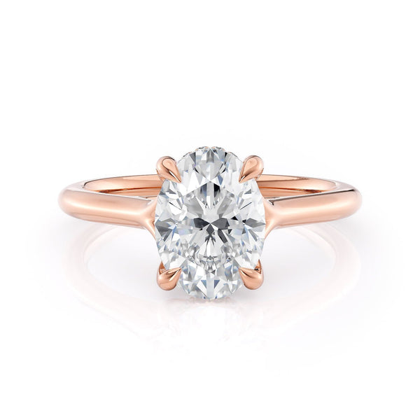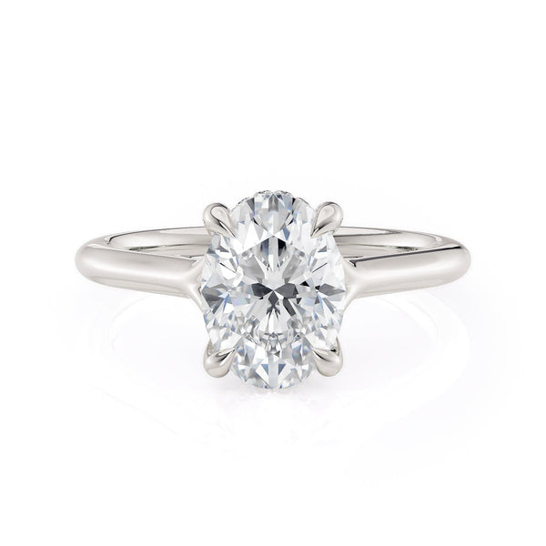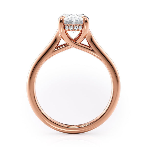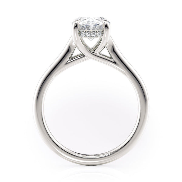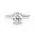The Crown R828-2 Oval ring boasts a criss cross prong design and diamonds encircling the center stone. Ideal for those seeking a minimalistic, sophisticated, and understated solitaire band.