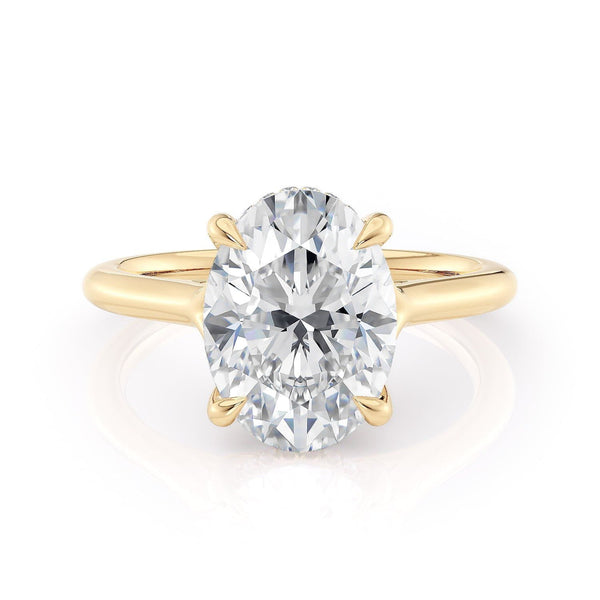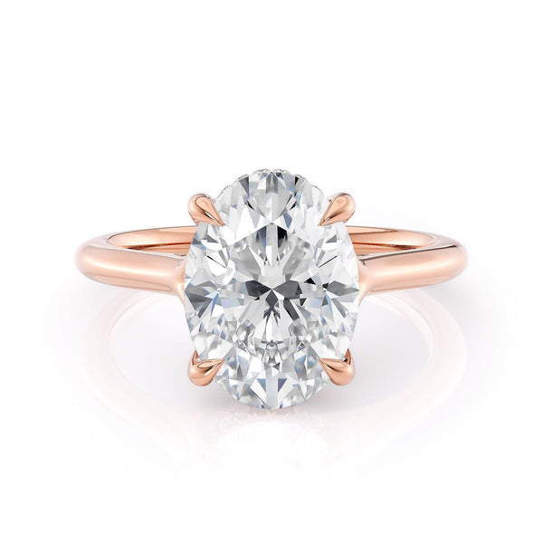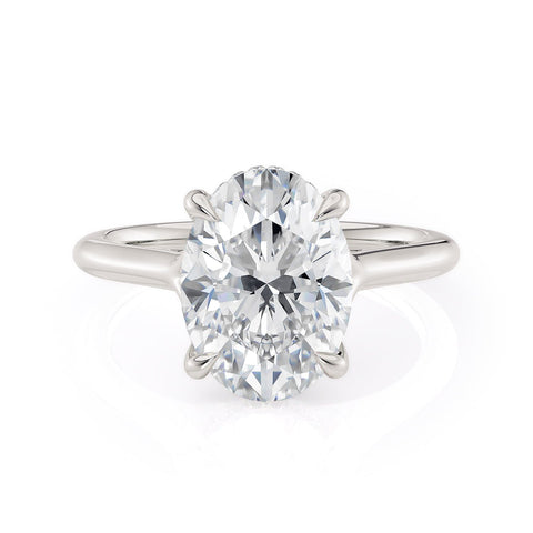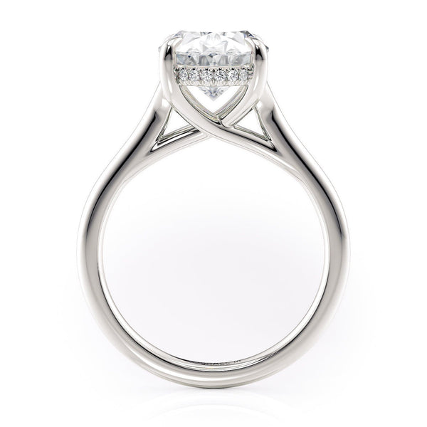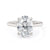 The Crown R828-3 Oval ring boasts a criss cross prong design and diamonds encircling the center stone. Ideal for those seeking a minimalistic, sophisticated, and understated solitaire band.