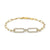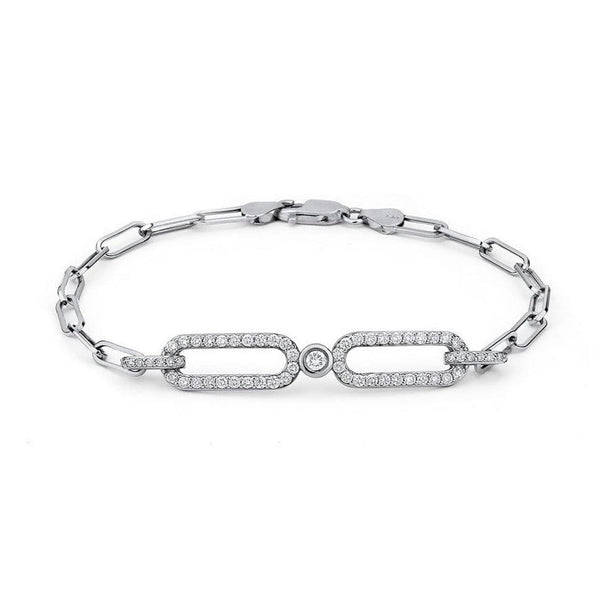 The Double LINK ID Bracelet captures the light with two pave links and a center bezel set diamond. The soft arch of the bracelet rests elegantly on the wrist. The fixed side pave jump rings connect the piece to the Link collections paperclip chain.