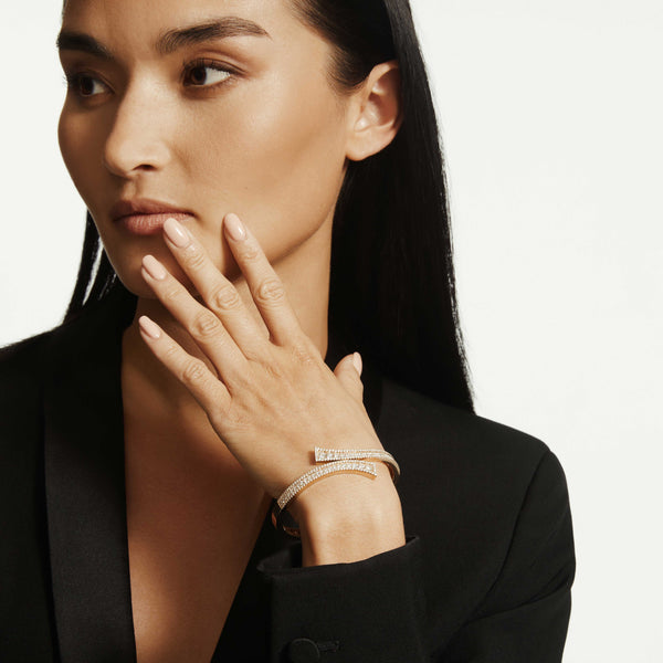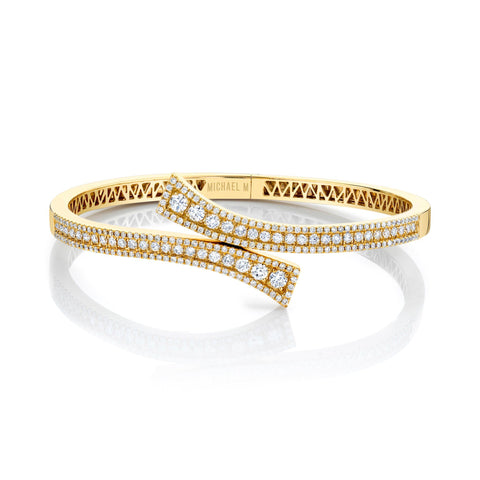 Inspired by our most popular women's wedding band, the EUROPA Bypass Cuff is made for statement. Clean lines swoop outward at the wrist with a dazzling number of sparkling diamonds pavé set in a three row design that is made to stun.