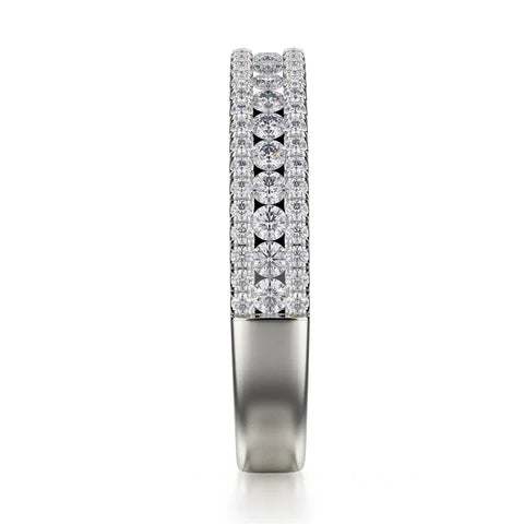 Crafted by the jewelry masters of Michael M, this wedding band is made using exquisite 18-karat white gold, breathtaking with a peerless gleam and glow. Long-lasting and resistant to tarnish, white gold makes for the perfect metal in accentuating the brilliant diamonds that adorn this piece.