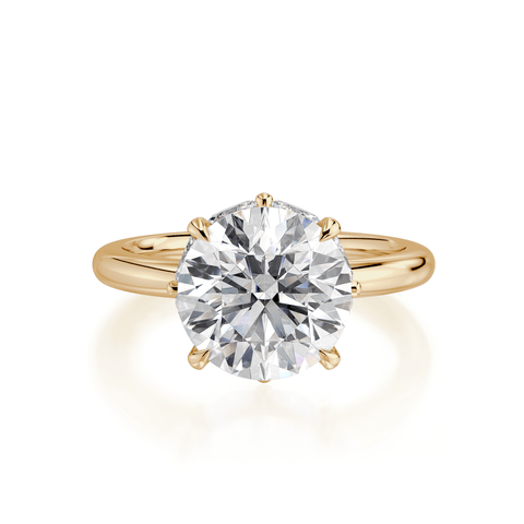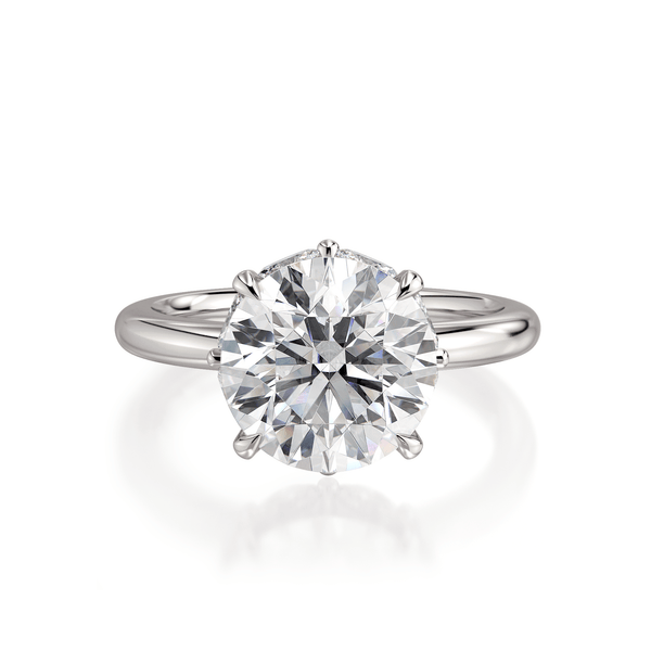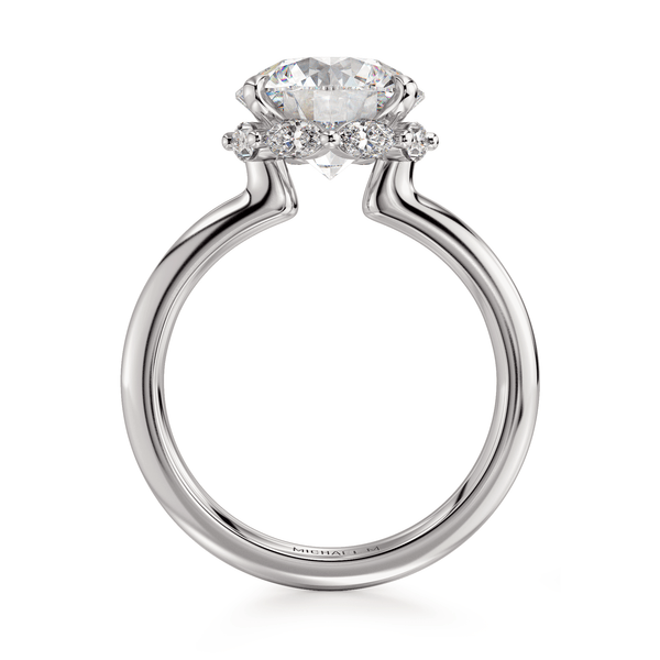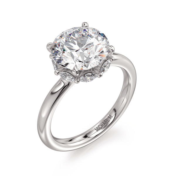 The R836-3 features a breathtaking 3 carat round center stone, elevated by a patent pending hidden halo design adorned with marquise shaped accents for added brilliance. This innovative under setting creates a captivating profile, catching light from every angle while remaining delicately tucked beneath the center stone. The shank features a subtle opening that channels light into the diamond, maximizing its radiance and ensuring it sparkles with every movement.