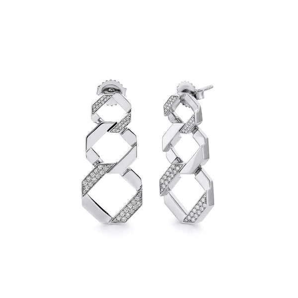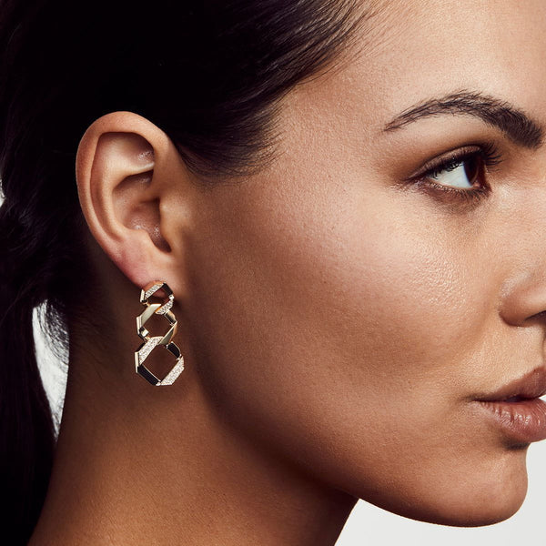 The OCTAVE chain link drop earrings features three tapered interlocking octagon shaped links with pave. These striking drop earrings combines modern bold elements and luxury statement with light capturing movement.