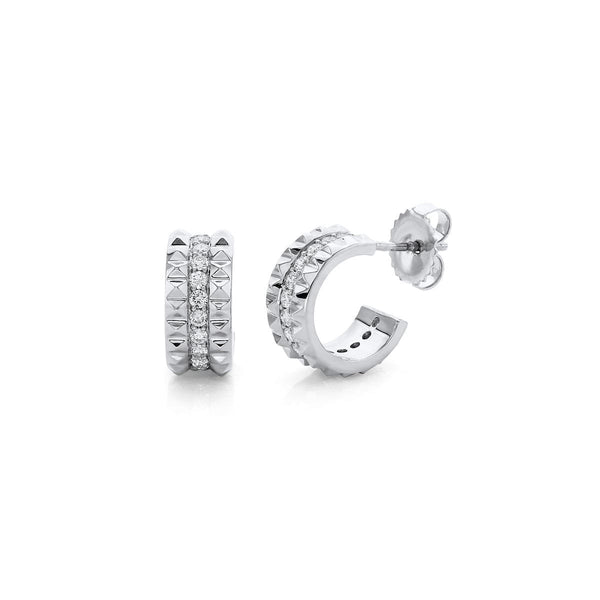 Designed to make a statement, our Tetra Pavé Huggie Hoops were masterfully crafted with a symmetrical structure. Featuring pavé set diamonds between two bands of mini pyramid studs, these hoops are sure to capture all eyes.