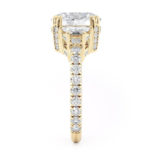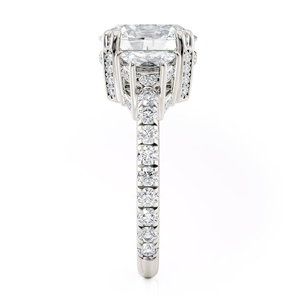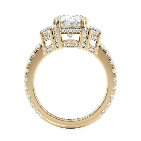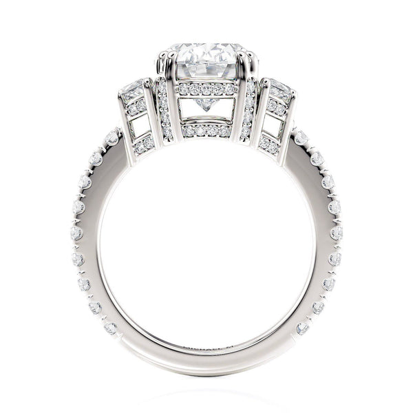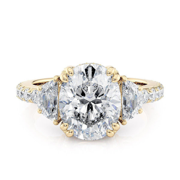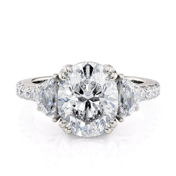 The R759-3 ring is in our Trinity collection. This particular ring boasts a 3 carat centerpiece and two large diamonds on either side, accompanied by a diamond-studded band.