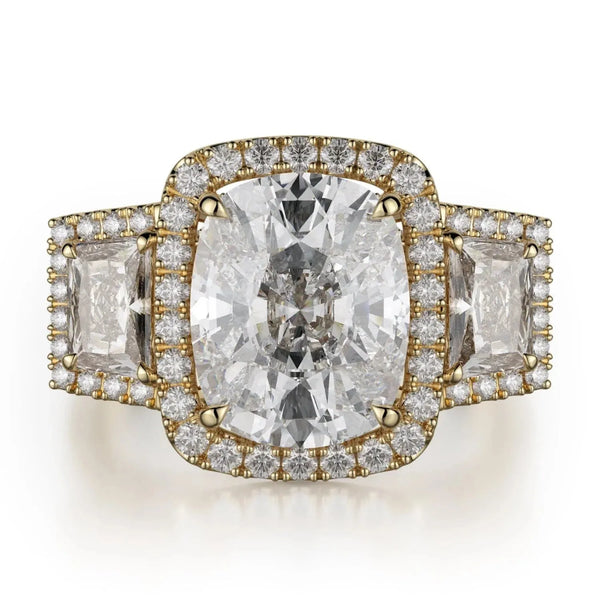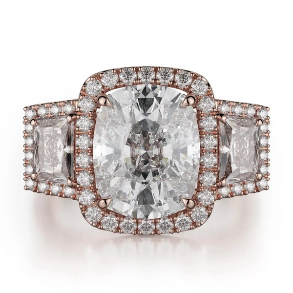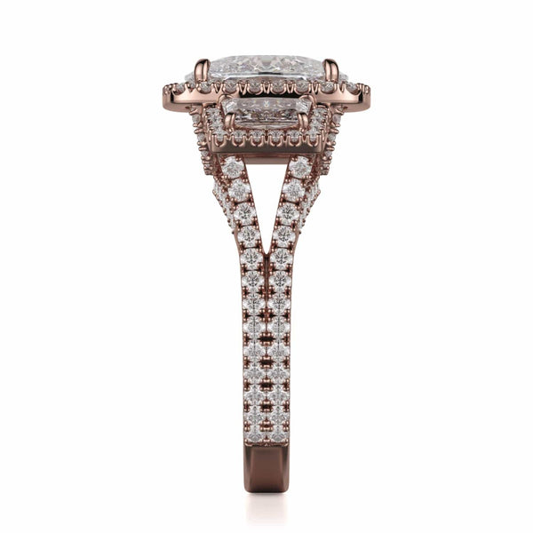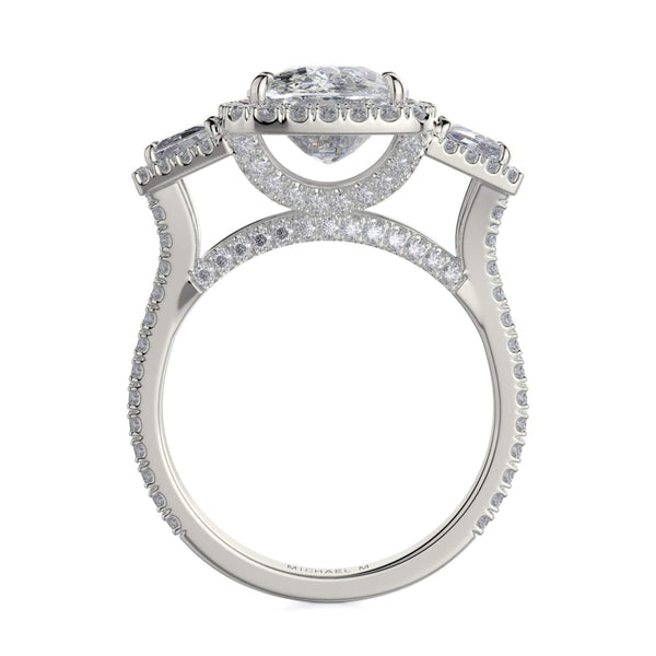 Our Trinity R775-3 features a 3 carat center stone flanked by two diamonds on either side. Each diamond is framed by a halo and set on a diamond-studded band. Adorned with a plethora of diamonds, this ring exudes luminance from all perspectives.