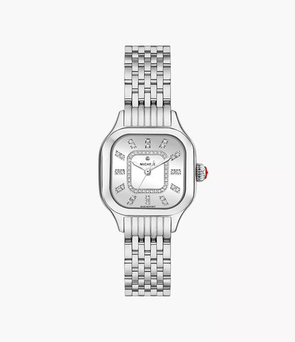Elegant curves add modern elegance to the case of MICHELE's stunning Meggie watch that sparkles with 60 hand-set diamonds (0.19 carat weight) on the silver mirror dial with diamond inner ring and double diamond indexes. This watch features a Swiss movement and a gleaming 14mm seven-link stainless steel bracelet made specifically for the Meggie collection interchangeable with any 14mm MICHELE strap