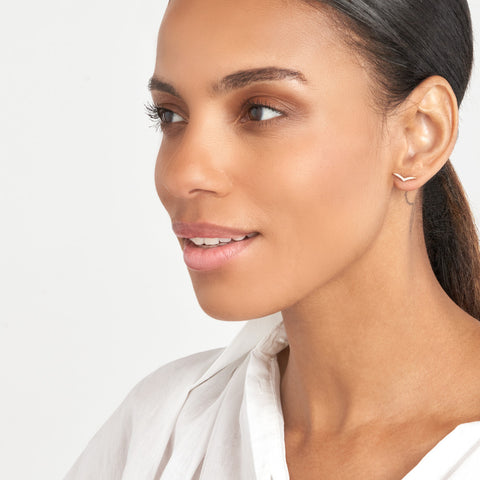 These dainty, yet stunning curved bar stud earrings are covered with 1/15tcw diamonds.