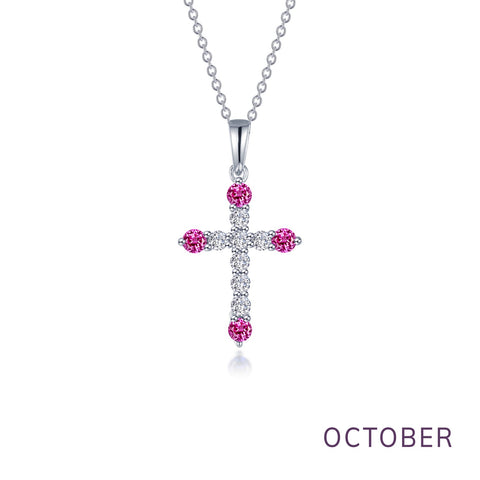 October - Tourmaline. Adorn yourself with Lafonn's birthstone jewelry. This cross pendant features Lafonn's signature Lassaire simulated diamonds and four simulated pink tourmalines in sterling silver bonded with platinum. The pendant comes on an adjustable 20" chain.