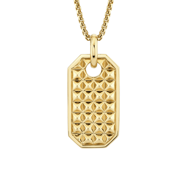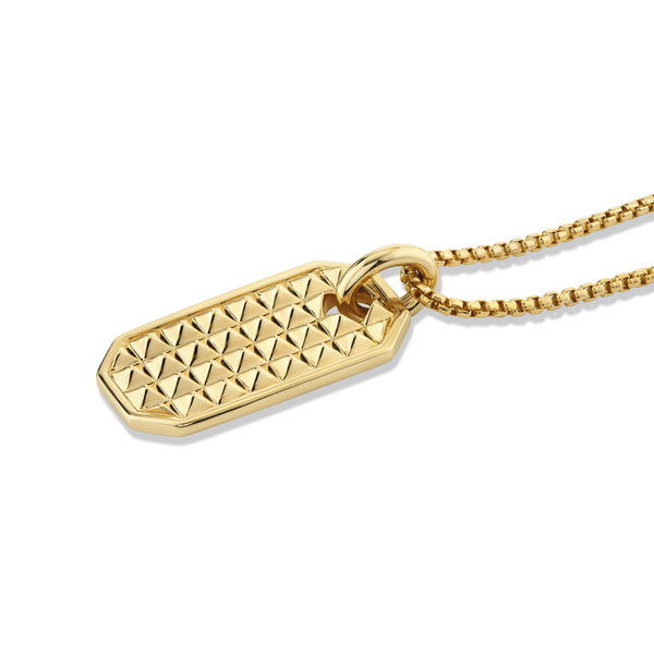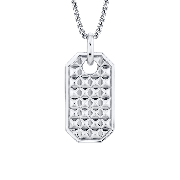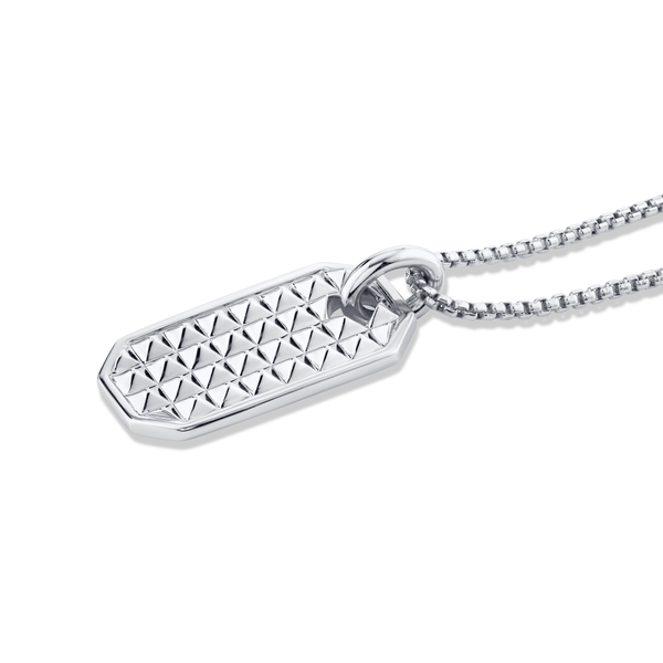 The pyramid textured motif creates a masculine look for the sophisticated man. Strong and powerful this Men's Tetra dog tag pendant is the finishing touch to complete your look. Indulging in the Tetra collection details with angled corners and signature Michael M back gallery.