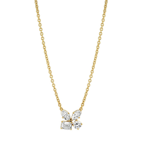 A captivating expression of modern elegance, the Montage Cluster Necklace features a radiant arrangement of mixed-cut diamonds in an organic, sculptural silhouette. Showcasing two marquise, one emerald, and one round-cut diamond, this exquisite design highlights the brilliance of each shape in perfect harmony. Suspended from a delicate 1.5mm round cable chain, it offers a refined yet statement-worthy look.