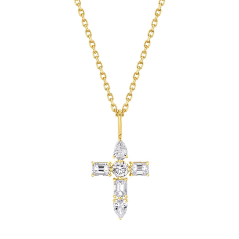 This cross pendant features a stunning combination of Montage mixed cut diamonds and emeralds, accented with pear and round cut diamonds. The result is a timeless piece of jewelry that offers a unique blend of elegance and sparkle. With the addition of high-quality materials and careful craftsmanship, this pendant is built to last and make a statement for years to come.