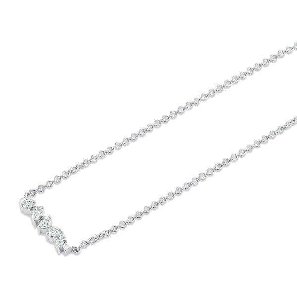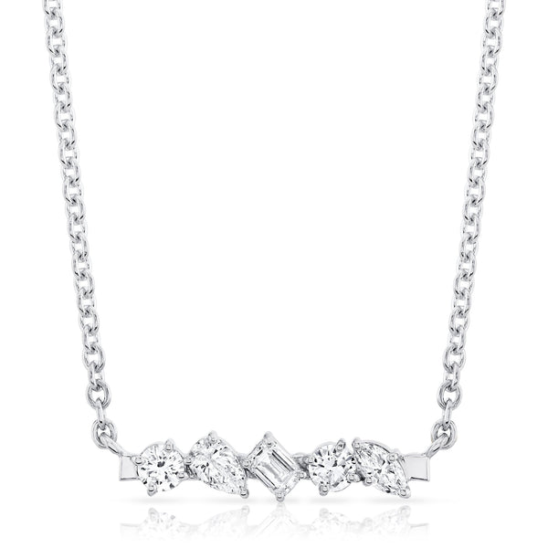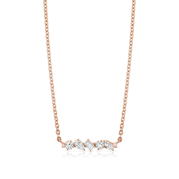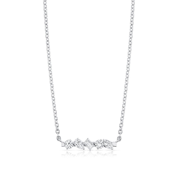 A striking bar necklace showcasing a curated blend of diamond cuts: round, pear, emerald, and marquise, each selected to complement the others. The varied faceting creates an understated yet captivating presence, ideal for elevating both everyday elegance and special occasions. A versatile piece that speaks to refined taste and appreciation for fine craftsmanship.