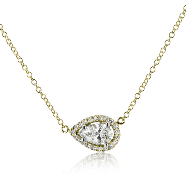 This necklace features a pear-shaped diamond framed by a delicate halo of smaller diamonds, suspended horizontally on a fine chain. Its elegant and modern design adds just the right touch of sparkle to any look.