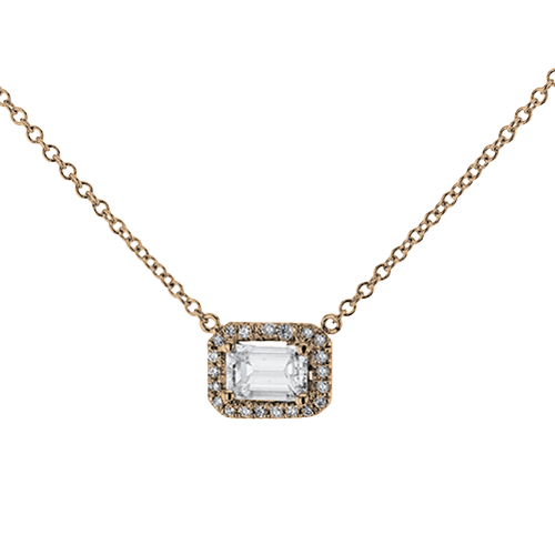 This necklace highlights a striking emerald-cut center stone framed by a glittering diamond halo for a timeless look. Its modern yet classic design makes it a versatile piece that effortlessly elevates any outfit.