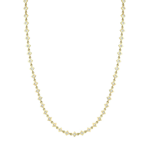 A modern graphic point of view on a classic. The Princess Bezel Tennis Necklace is a series of princess cut stones positioned corner to corner, featuring the MM signature bezel with a wider frame of gold surrounding the diamond for a visually impactful style. Everyday luxe whether layered or on its own.