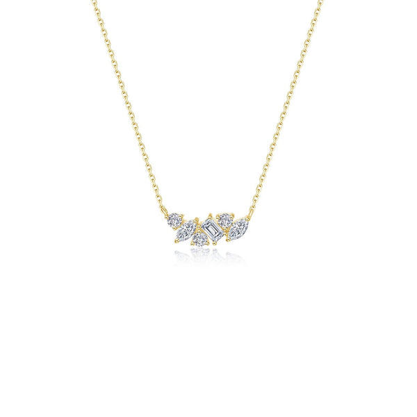 Playful yet sophisticated. This necklace features Lafonn’s signature Lassaire simulated diamonds in an eclectic mix of shapes. Perfect for both casual and formal looks. Crafted in sterling silver plated with gold.