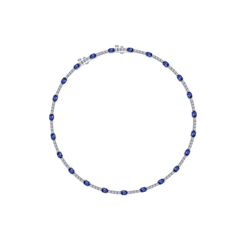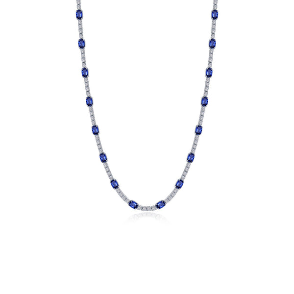 Elegant with modern flair. This necklace features cushion-cut lab-grown sapphires and Lafonn’s signature Lassaire simulated diamond, set in sterling silver bonded with platinum. The rich blue stone contrast beautifully with the brilliant whites.