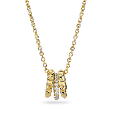 Three ring charms created the movement for the Tetra Triple Ring Necklace. The center ring adds sparkling pave and the two outside rings have structured tiny pyramid studs.