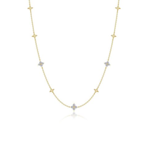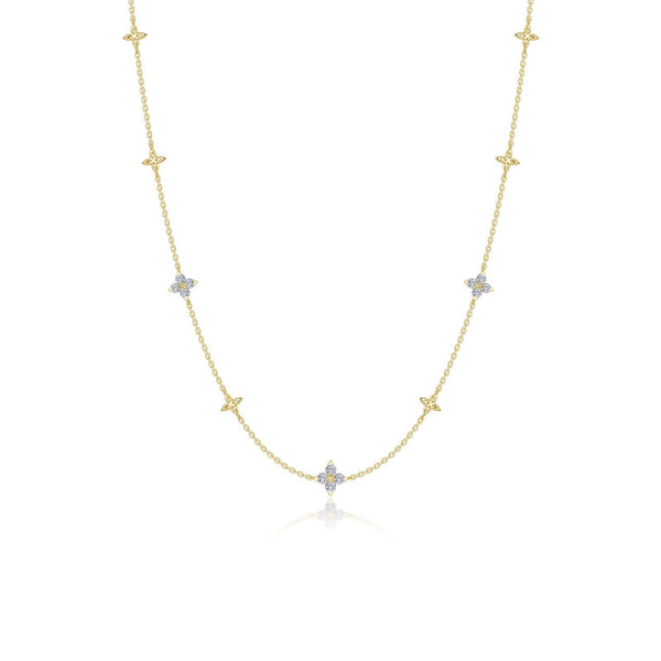 What better way to celebrate than with a hint of flora? This flower-inspired design represents the powerful energy that brings forth new life. This necklace is the perfect blend of nature-inspired charm and refined luxury. Whether as a statement piece or a subtle accent, this necklace brings a timeless elegance to any occasion. Set with Lafonn's signature Lassaire clear simulated diamonds in sterling silver plated with gold.
