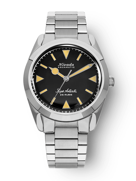 The Super Antarctic is a faithful reedition of the vintage one with a matte black dial and three Swiss Super luminova options, cream, white and green. Diameter is contained to 38 mm and lugs to lugs to 45 mm with a great thickness of 11,1 mm. You will notice the legendary gold medallion on the caseback