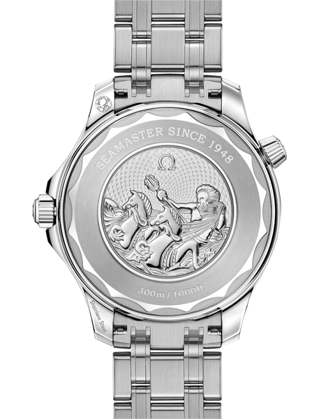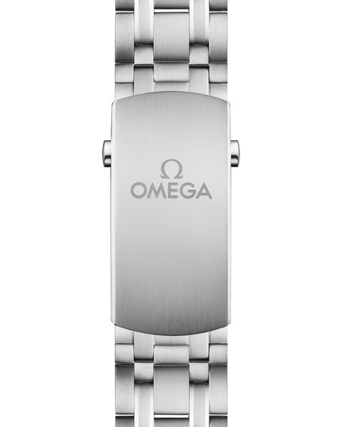 This 42 mm Seamaster Diver 300M has a case and bracelet in stainless steel. The ceramic dial, in OMEGA’s own Summer Blue, is PVD-treated and has a gradient finish to reflect the watch’s level of water resistance. It also includes the 300M’s famous wave pattern. A blue ceramic bezel with a Summer Blue enamel (Grand feu) diving scale encircles the dial, which has rhodium-plated skeleton hands and raised indexes, filled with a unique light blue Super-LumiNova. Turning the watch over reveals a stamped commemorative Seamaster logo depicting a trident-bearing Poseidon and two seahorses: OMEGA’s 1956 original and the brand’s current design. Behind which sits OMEGA’s Co-Axial Master Chronometer calibre 8800, certified at the industry’s highest level by the Swiss Federal Institute of Metrology (METAS).