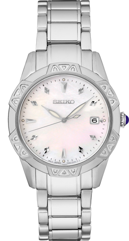 From the Diamond Collection. Designed for everyday elegance, this distinctive watch features 14 diamonds bezel-set in six directions to suggest the spread of sunlight. An updated slightly larger case, paired with the classic touches of a mother-of-pearl dial and cabochon crown, provides smooth day to night style. Crafted of stainless steel, this graceful watch includes uniquely shaped markers, a date calendar, scratch-resistant sapphire crystal and tri-fold push button release clasp. 10 bar, 100M Water Resistant