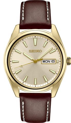 From the Essentials Collection. Offering classic dress/sport designs, in two sizes to suit anyone’s personal style, the Essentials Collection provides the ideal solution for everyday wear. Crafted of stainless steel with gold-finish and a scratch-resistant sapphire crystal, this perfectly balanced design features a contemporary minimalist light champagne sunray dial with gold accents, day/date calendar, and LumiBrite hands and markers for superior visibility. To complete the tailored look, the brown leather strap includes contrast stitching. 10 bar, 100M Water Resistant