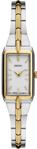 From the Essentials Collection. Inspired by jewelry design, this elegant watch is styled to be perfect for both every day and special occasions. Featuring a white dial with gold accents, this sophisticated timepiece is crafted of stainless steel with two-tone finish. 3 bar, 30M Water Resistant