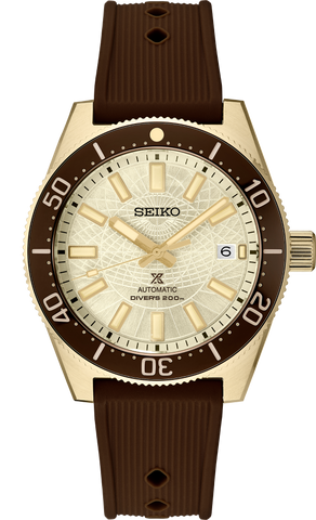 1965 Diver's Watch Modern Re-interpretation Save the Ocean U.S. Limited Edition. Designed for those who treat life as the ultimate adventure, the Seiko Prospex line meets every challenge with technological excellence and style. Part of a rich legacy of innovation in high-intensity timekeeping, Prospex continues to celebrate a long history of sports watch excellence with recreations and reinterpretations of landmark achievements. Updated with today's technology and materials, and a sleeker and thinner profile, this extraordinary Limited Edition, exclusively available in the U.S. in a controlled production run of 300 with the serial number engraved on each caseback, reimagines Seiko's 1965 diver's watch, the first made in Japan, with a water resistance,legibility and durability that made it standard equipment on the Japanese Antarctic Research Expedition (JARE), and propelled Seiko into the forefront of dive watch design. Paying tribute to underwater archaeology, this reinterpretation features a light champagne sunray dial with a design inspired by ancient astrolabes, used to find latitude and time based on the position of the stars and the sun. The caliber 8L35 26-jewel automatic movement, hand-assembled at Seiko's Shizukuishi watch studio with the increased torque necessary for smooth operation of the enlarged diver's watch hands, beats at a frequency of 28,800 vibrations per hour, with a power reserve of approximately 50 hours, and provides manual winding capability. Following ISO standards for scuba diving to depths of up to 200 meters, this superbly functional watch,in stainless steel with gold finish, also includes a date calendar, LumiBrite markers and hands for enhanced legibility, dual curved sapphire crystal with anti-reflective coating on the inner surface, screwdown crown and caseback,brown uni-directional rotating elapsed timing bezel and brown silicone strap. As part of Seiko's "Save the Ocean" campaign, a portion of the proceeds from sales of this exceptional Limited Edition will be contributed to marine conservation. Packaged in a Limited Edition collectors' box. 200m Water Resistant