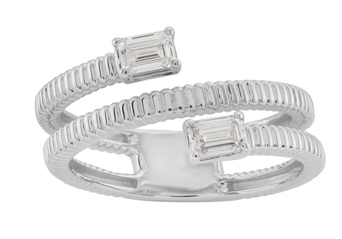 This fashion diamond ring is available in 14K White Gold. There are a total of 2 stones. There are emerald cut diamonds with a total carat weight of 0.42ct set in a Prong Set setting