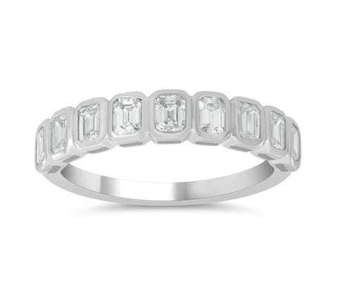 This fashion diamond ring is available in 14K White Gold. There are a total of 9 stones. There are emerald cut diamonds with a total carat weight of 0.80ct set in a Bezel Set setting