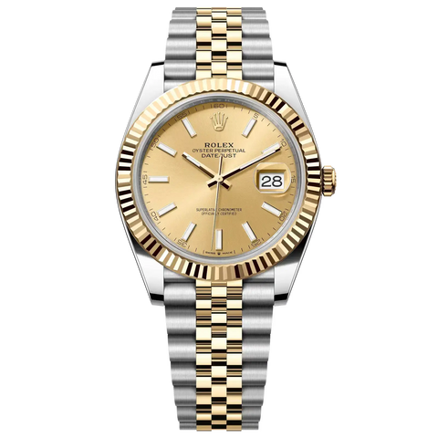 This Oyster Perpetual Datejust 41 in Oystersteel and yellow gold features a champagne-colour dial and a Jubilee bracelet.