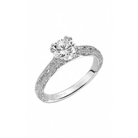 Diamond engagement ring with high polished, engraved shank design with milgrain and double prong setting.