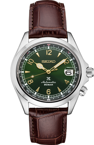 From the Prospex Collection. Designed for those who treat life as the ultimate adventure, the Seiko Prospex line follows every challenge with technological excellence and style. A modern re-imagining of Seiko's first sport watch, introduced in 1959, this distinctive timepiece is an upgrade of a highly successful Spring 2019 limited edition. Equipped with a rotating inner compass bezel for outdoor adventure, this unique design features a sunray-finish green dial with gold accents, LumiBrite hands and markers, magnified date window, and sapphire crystal with anti-reflective coating on the inner surface. The 24-jewel automatic movement beats at a frequency of 21,600 vibrations per hour, with a power reserve of approximately 70 hours, and can be wound manually or automatically. Crafted of stainless steel, with brown leather strap, secure tri-fold push button release clasp, screwdown crown and see-through caseback. 20 bar, 200M Water Resistant.