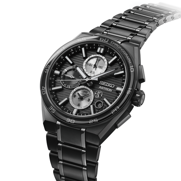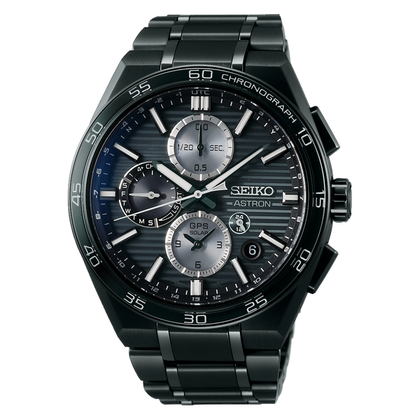 Astron GPS Solar Dual-Time Chronograph. Extending the legacy of the Seiko Astron, the world’s first commercially available quartz watch, today’s Astron is designed for a new generation of leaders to break through to a new future with excellence in both innovation and style. Combining solid tailoring with the highest degree of accuracy possible in a wristwatch, this exceptional timepiece is equipped with Seiko’s 5X83 caliber, offering both high-speed GPS dual time and time zone adjustment to 39 time zones and a chronograph function that measures elapsed time in 1/20th second increments. The precision watch also features an AM/PM indicator, daylight saving time function, power save function, perpetual day/date calendar correct to the year 2100, and a time transfer function that allows the user to switch the main time and dual time indications with the push of a button, all powered by light energy with no battery change required. Framed by a titanium bezel with a brilliant black sapphire insert, and topped with dual curved sapphire crystal with super-clear coating, the black patterned dial displays a distinct texture, made possible by improved charging efficiency of the solar cell, providing an outstanding contrast to the subdials. In addition to the four subdials, laid out vertically for a sporty look, the dial includes a date calendar and LumiBrite hands and markers for enhanced visibility in low-light conditions. Crafted of light and durable titanium with black super-hard coating, this superb timepiece has a contemporary feel thanks to the sleek lines, slim profile, and the compact and angular design that seamlessly flows from the case to the bracelet and includes a secure screwdown caseback and tri-fold push button release clasp with Smart Adjuster function. 10 bar, 100M Water Resistant